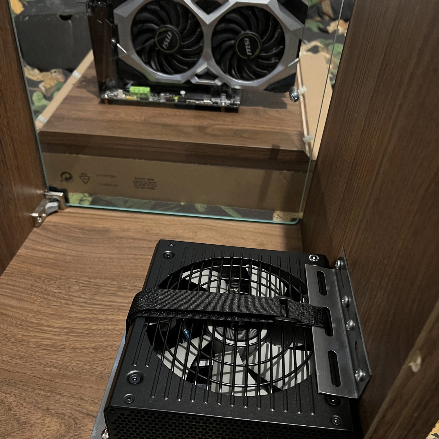 Next up, mounting the PSU somewhere out of the way. For this, I found some L brackets in the shed and screwed them into the top and side of the box. I also found a Velcro strap and used this to keep the PSU securely in place.